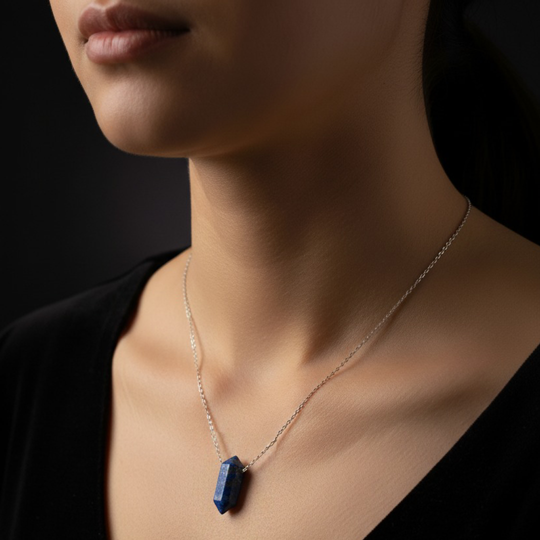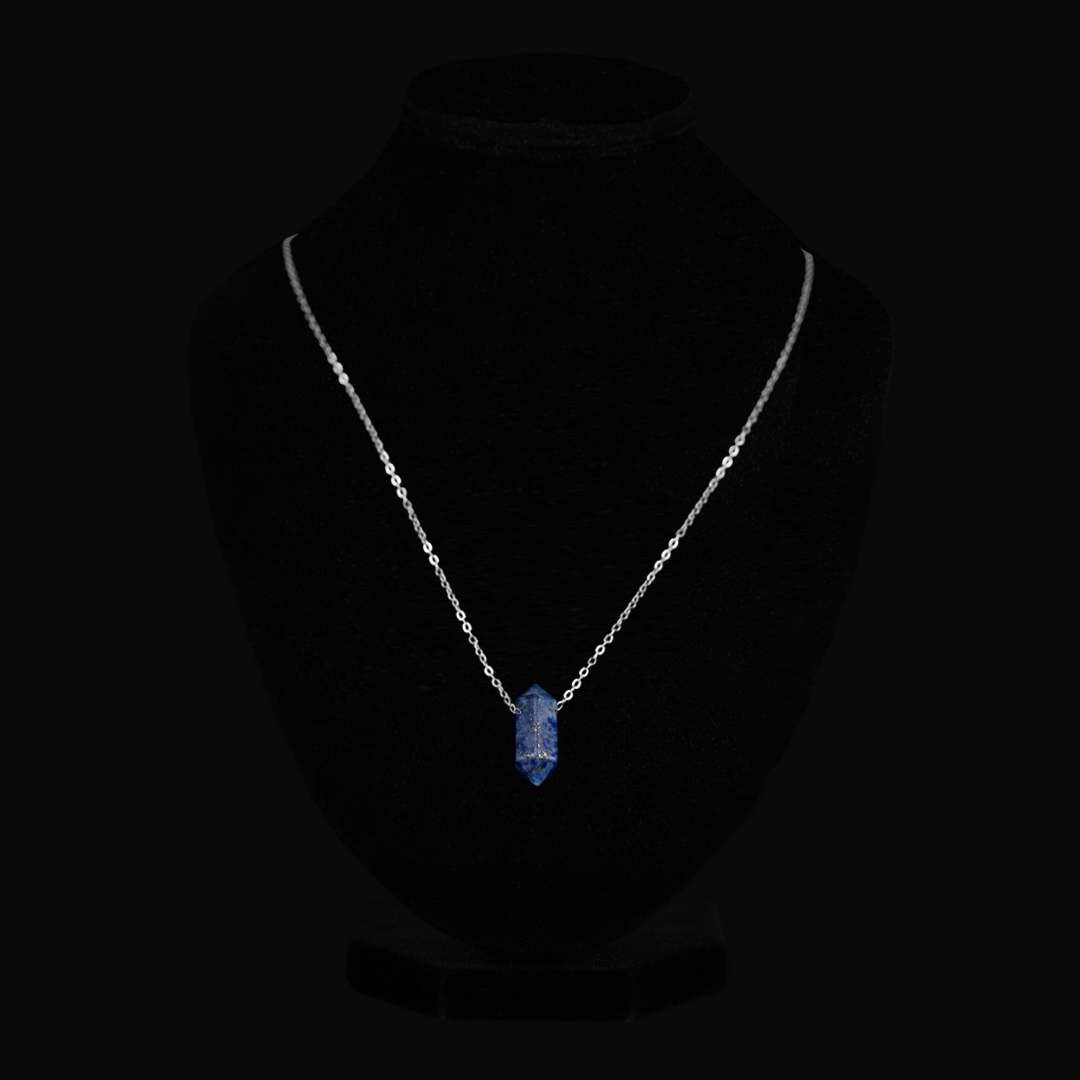 A slim silver-tone chain with a polished Lapis Lazuli double-point bullet pendant. Materials Lapis Lazuli Steel chain