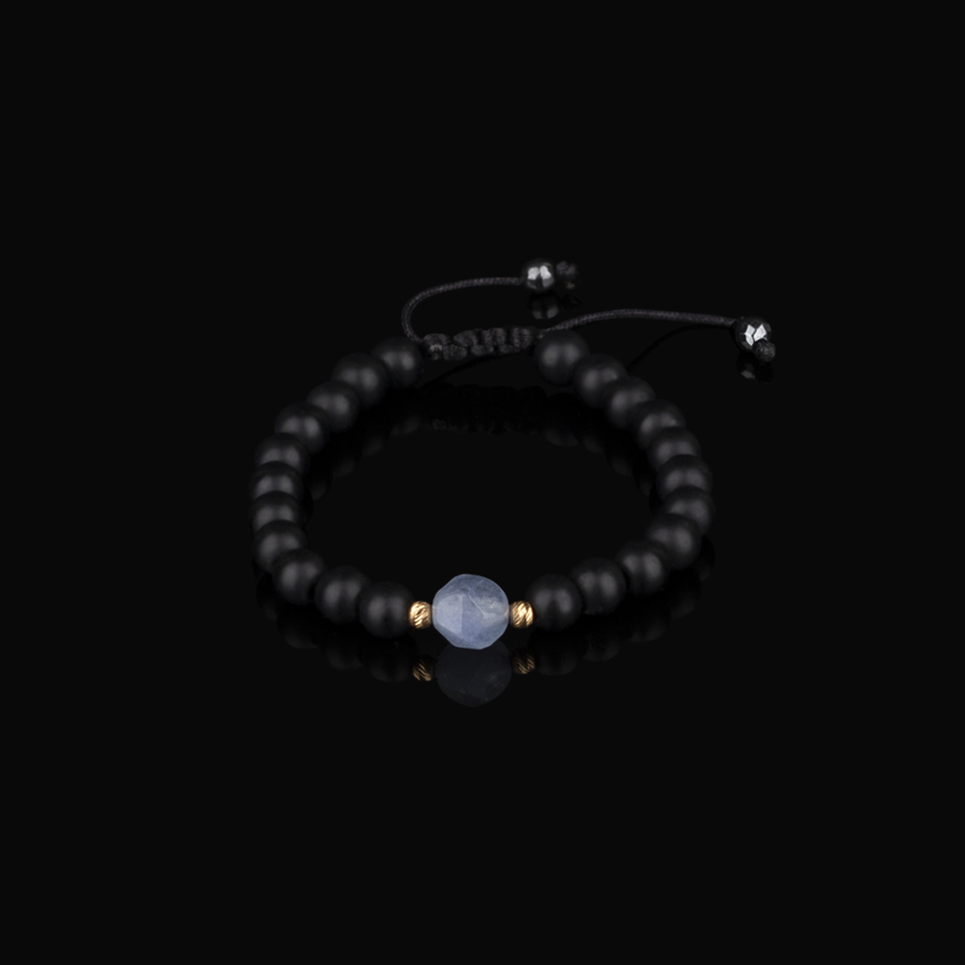 Handwoven Shamballa bracelet featuring a faceted Blue Tourmaline bead, accented with 2 3mm 18k Yellow Gold diamond-cut beads, 6mm Matte Onyx beads, and 4mm Hematite beads at the sliding knots.