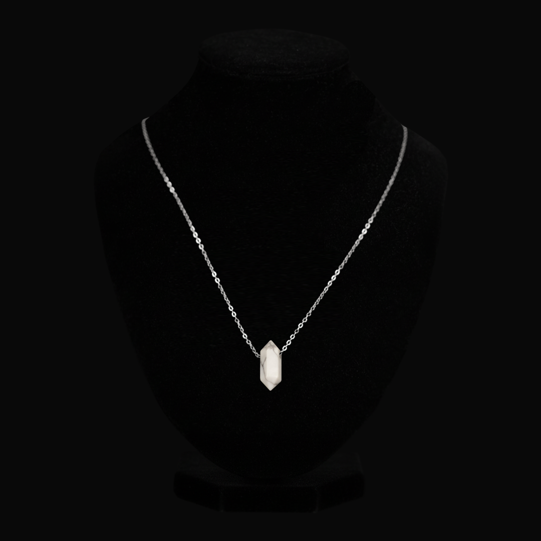 A slim silver-tone chain with a polished Howlite double-point bullet pendant.