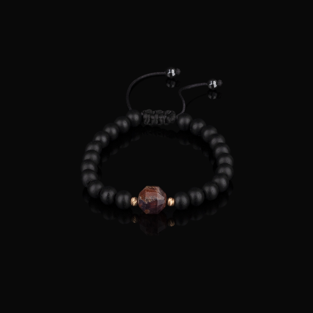 Handwoven Shamballa bracelet featuring a faceted natural Amethyst quartz, accented with 2 3mm 18k Rose Gold diamond-cut beads, 6mm Matte Onyx beads, and 4mm Hematite beads at the sliding knots.