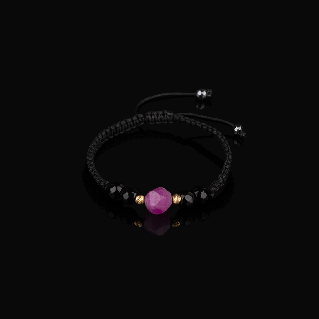 Handwoven Shamballa bracelet featuring a faceted Pink Tourmaline bead, accented with 2 3mm 18k Yellow Gold diamond-cut beads, 6mm faceted Onyx, and 4mm Hematite beads at the sliding knots.