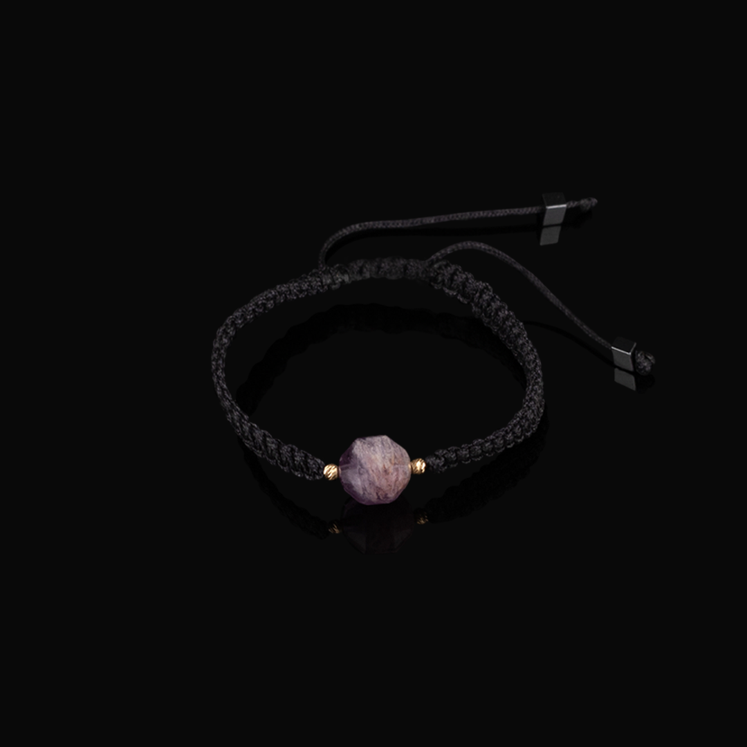 Handwoven Shamballa bracelet featuring a faceted natural Amethyst quartz, accented with 2 2.5mm 18k Yellow Gold diamond-cut beads, and 4mm Hematite beads at the sliding knots.