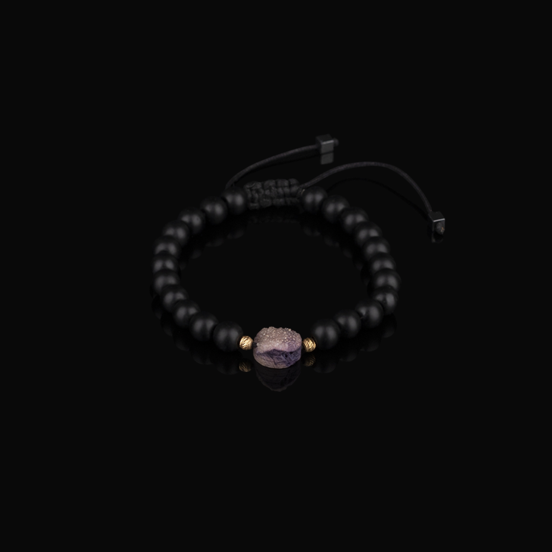 Handwoven Shamballa bracelet featuring a faceted natural Druzy Amethyst quartz, accented with 2 3mm 18k Yellow Gold diamond-cut beads, 6mm Matte Onyx beads, and 4mm Hematite beads at the sliding knots.