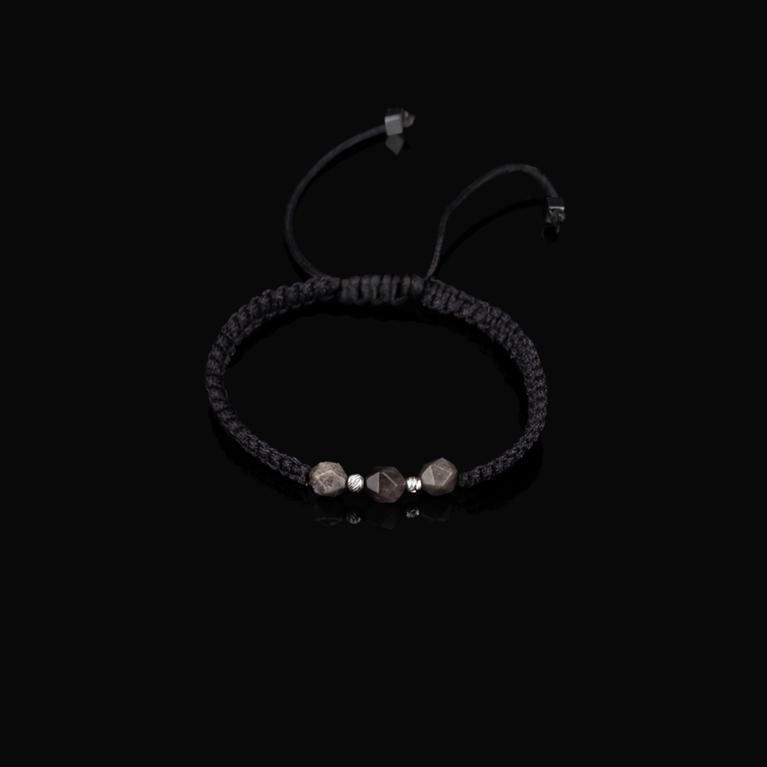 Handwoven Shamballa bracelet featuring 3 faceted Rhombus Grey Obsidian beads, accented with 2 3mm 18k White Gold diamond-cut beads, and 4mm Hematite beads at the sliding knots.