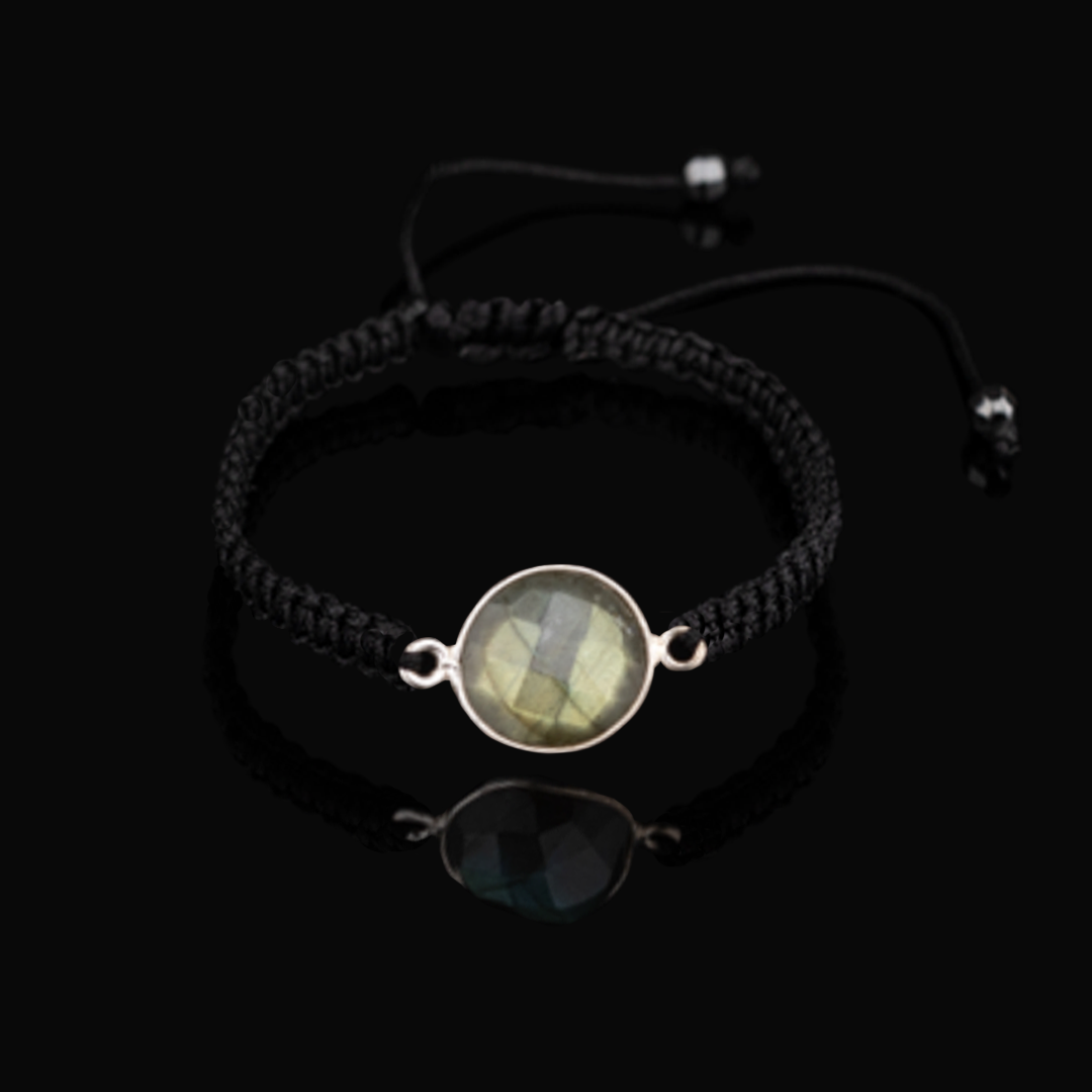Handwoven black cord bracelet with a faceted Labradorite gemstone set in a 925 Sterling Silver bezel, finished with Hematite beads at the adjustable sliding knots.