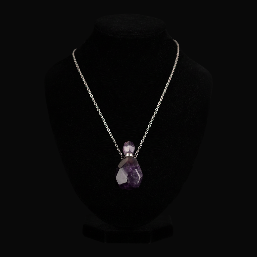 A sleek stainless-steel chain carrying a faceted Amethyst perfume-bottle pendant, a tiny, wearable vial for a few drops of your favorite scent or essential oil.