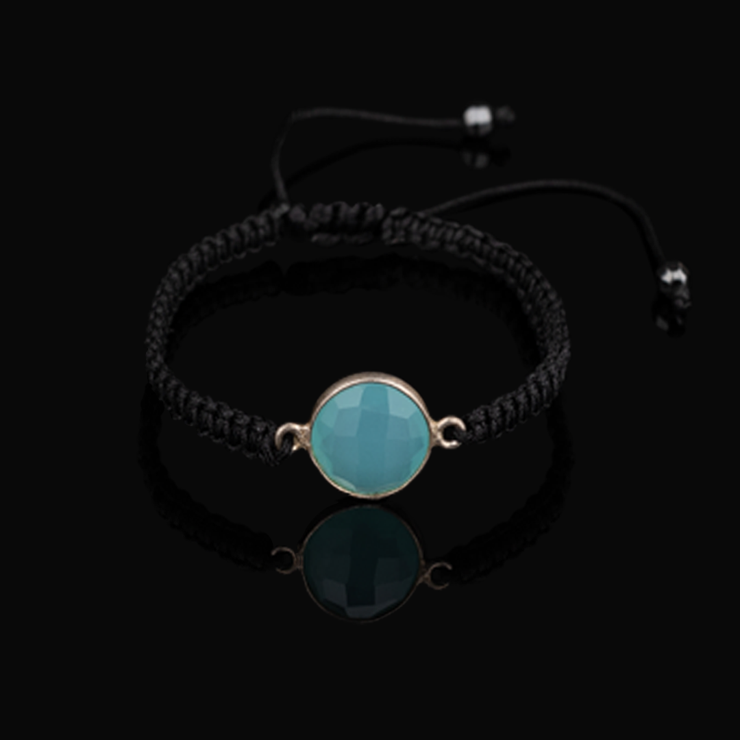 Handwoven black cord bracelet with a faceted Chalcedony gemstone set in a 925 Sterling Silver bezel, finished with Hematite beads at the adjustable sliding knots.