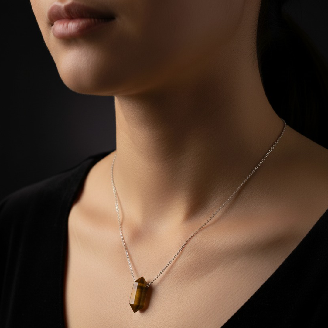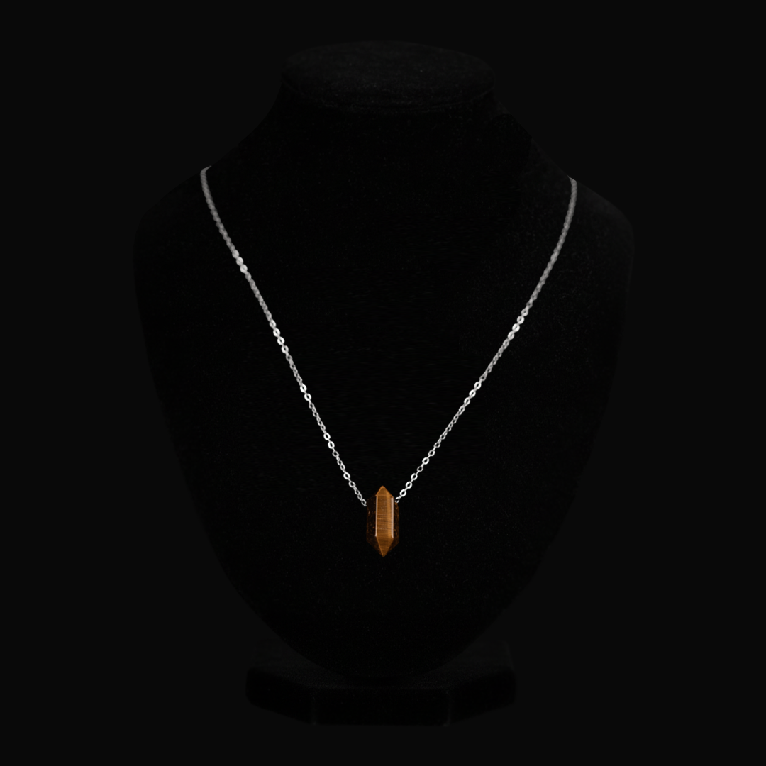 A slim silver-tone chain with a polished Tiger Eye double-point bullet pendant.