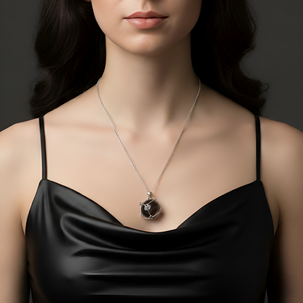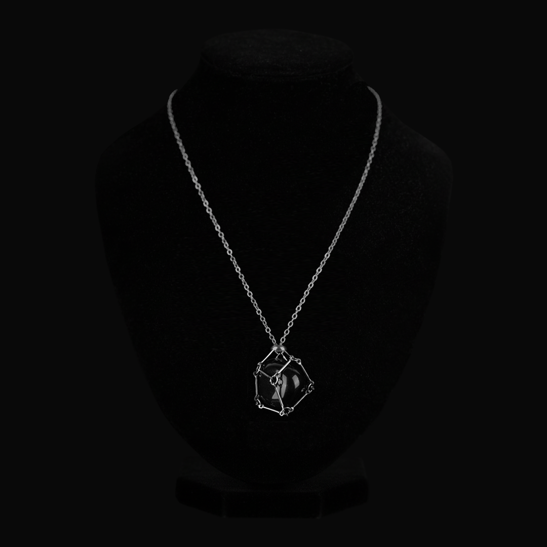 A stainless-steel cage locket pendant on a sleek chain, holding a polished Black Obsidian tumble. The locket opens so you can swap the stone anytime to match your mood.