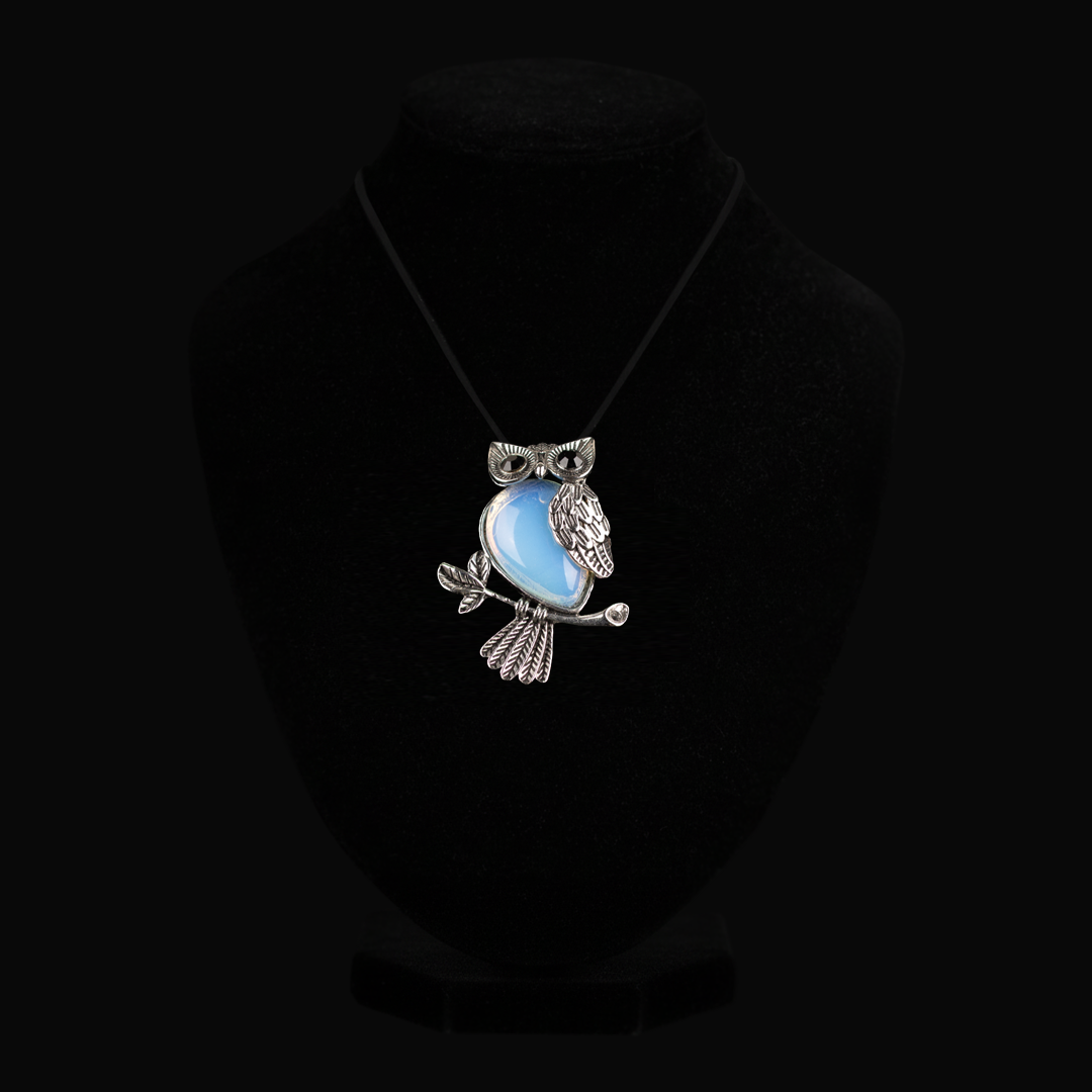 Silver-tone Owl pendant with a polished Opal focal stone, strung on a simple black cord for everyday wear.