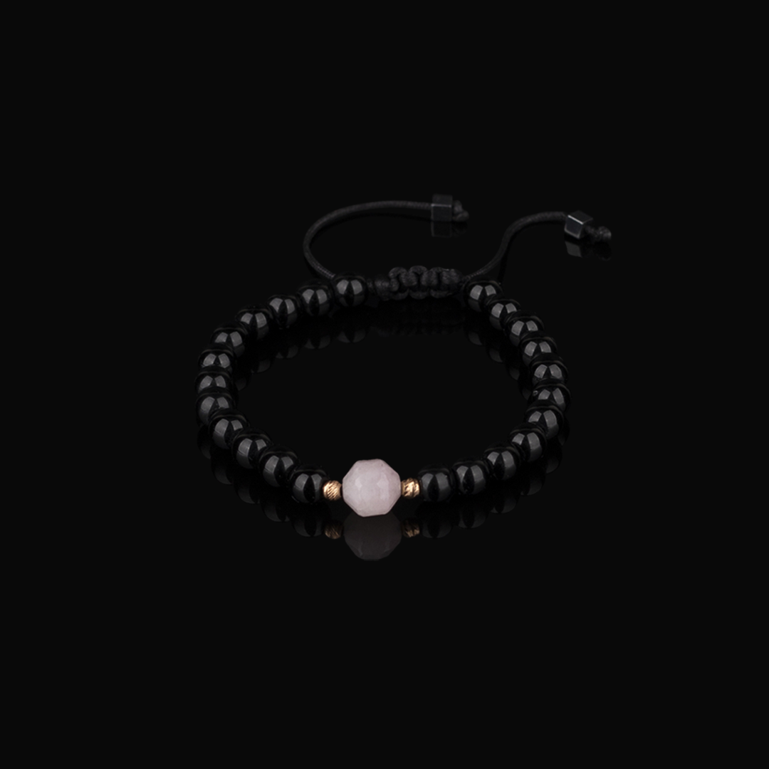 Handwoven Shamballa bracelet featuring a faceted Rose Quartz bead, accented with 2 3mm 18k Yellow Gold diamond-cut beads, 6mm Shiny Onyx beads, and 4mm Hematite beads at the sliding knots.