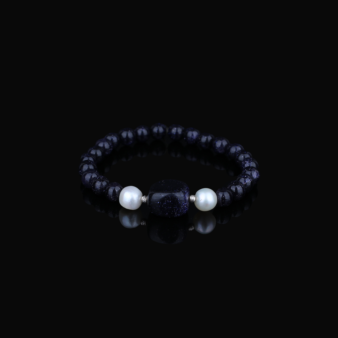 Handwoven shamballa bracelet with a natural Sandstone center bead and 6mm Sandstone beads, accented with two Cultured Pearls, and two 3mm 18k White Gold diamond-cut beads.