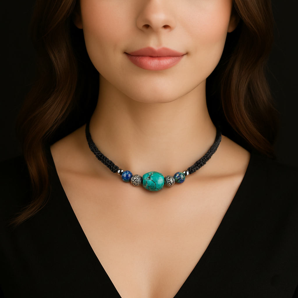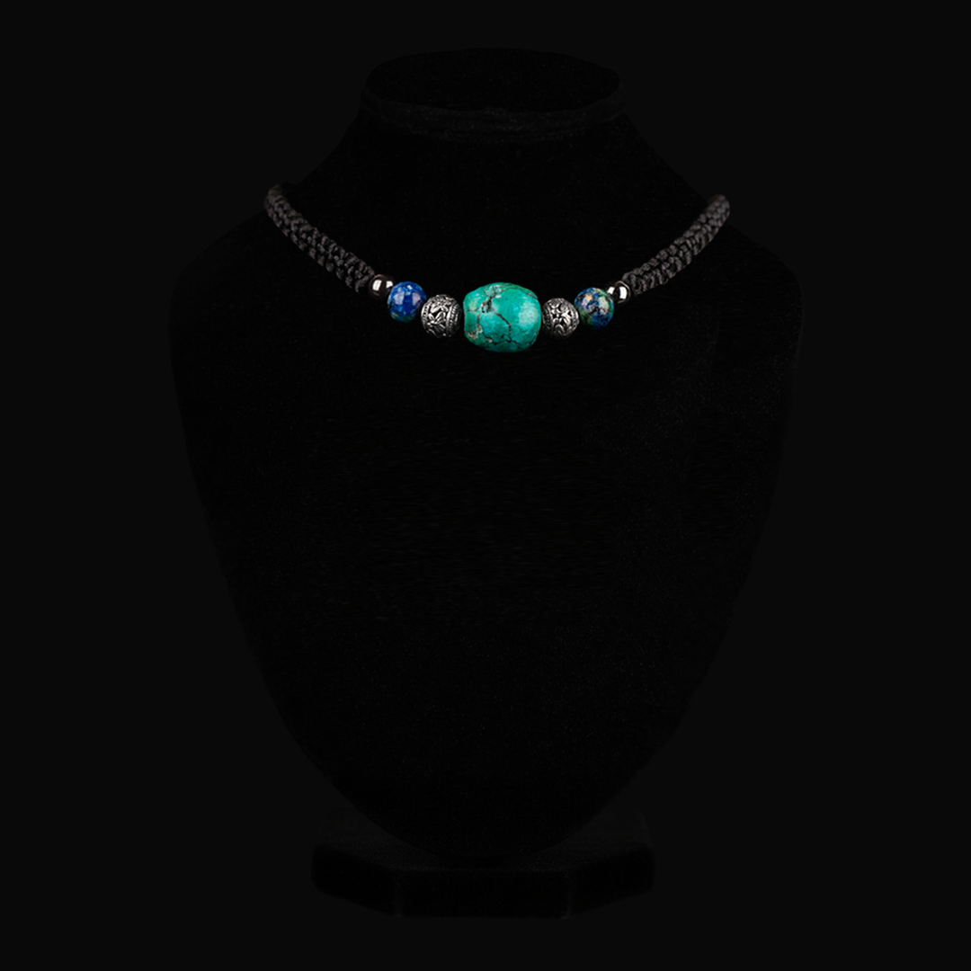 Handmade adjustable choker centered on a natural Turquoise bead, with silver-tone Tibetan spacers, Lapis Lazuli, and Hematite accents. Hand-braided on black cord with a sliding-knot closure.
