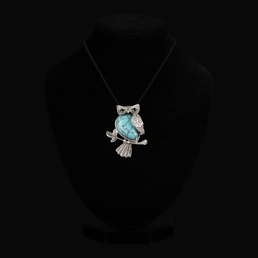 Silver-tone Owl pendant with a polished Turquoise focal stone, strung on a simple black cord for everyday wear.